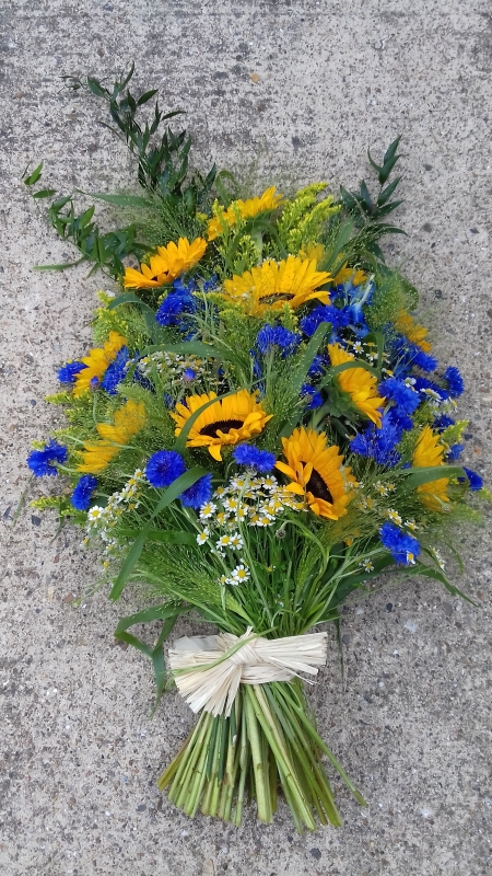 Sheaf of Sunflowers, Cornflowers, Tanacetum, Fountain Grass, Italian Ruscus, Solidago [FF374]