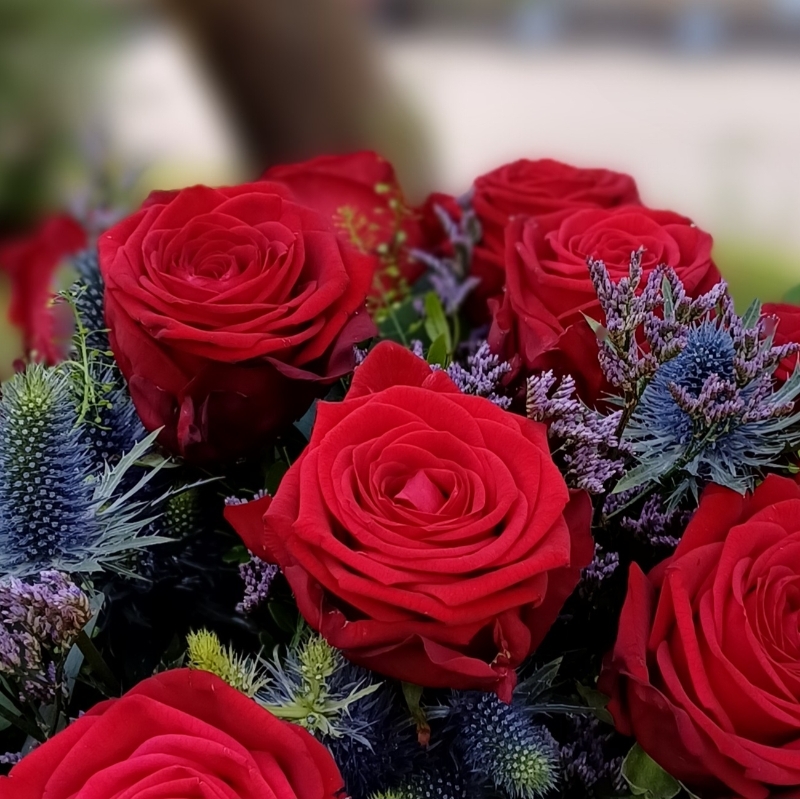 Hand tied bouquet in water with gorgeous Red Roses (choose 12/18/24), Eryngium (Thistles), Limonium, Aspidistra