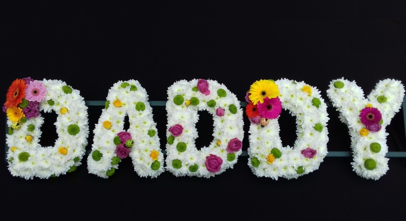 DADDY of White Double Chrysanthemums with a variety of colourful flowers among the letters: Light Purple Roses, Pale Pink, Orange, Yellow and Light Purple Germinis, Yellow Spray Roses and Green Spray Chrysanthemums.